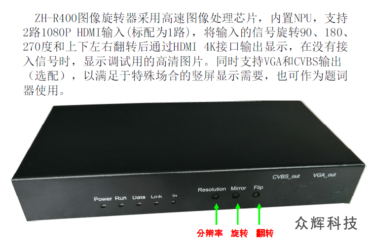 此款為ZH-R100的升級高端版本ZH-R400,此版本為全新發售,Linux嵌入式系統,支持NPU,全按鍵操作,自動記憶,自帶測試底圖,沒有信號接入時也可以調試,輸出分辨率可以設置為1080P和2160P。支持上下左右鏡像,可做為題詞器使用。彌補之前版本分辨率低,顯示文字不清楚的問題,如果對顯示要求不高,價絡敏感的用戶也可以選擇ZH-R100 如果有更高要求,也可以選擇ZH-R500,4K輸入和4K輸出版本,如果喜歡安卓系統可以選擇ZH-R300