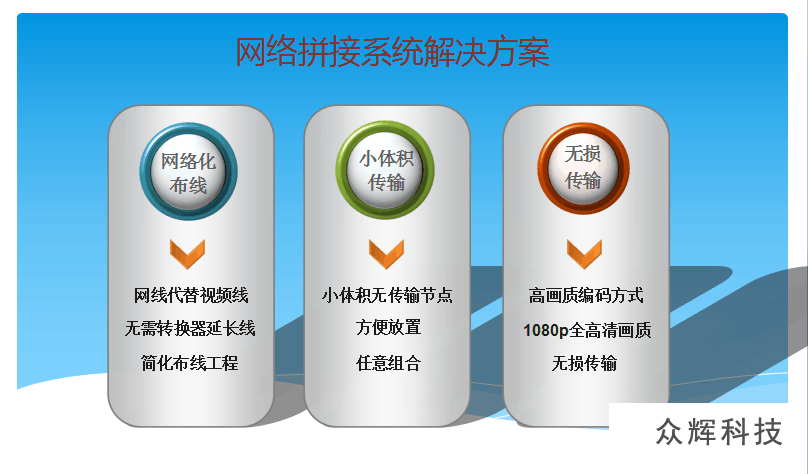 眾輝及時跟上當今快速創新的步伐,進行網絡產品設計和開發,把新的產品、新的技術應用到安防監控、視頻會議系統中,利用現有網絡,成熟的網絡技術和拼接技術,實現網絡拼接,這是對傳統的顛覆,拼接的一次革命。